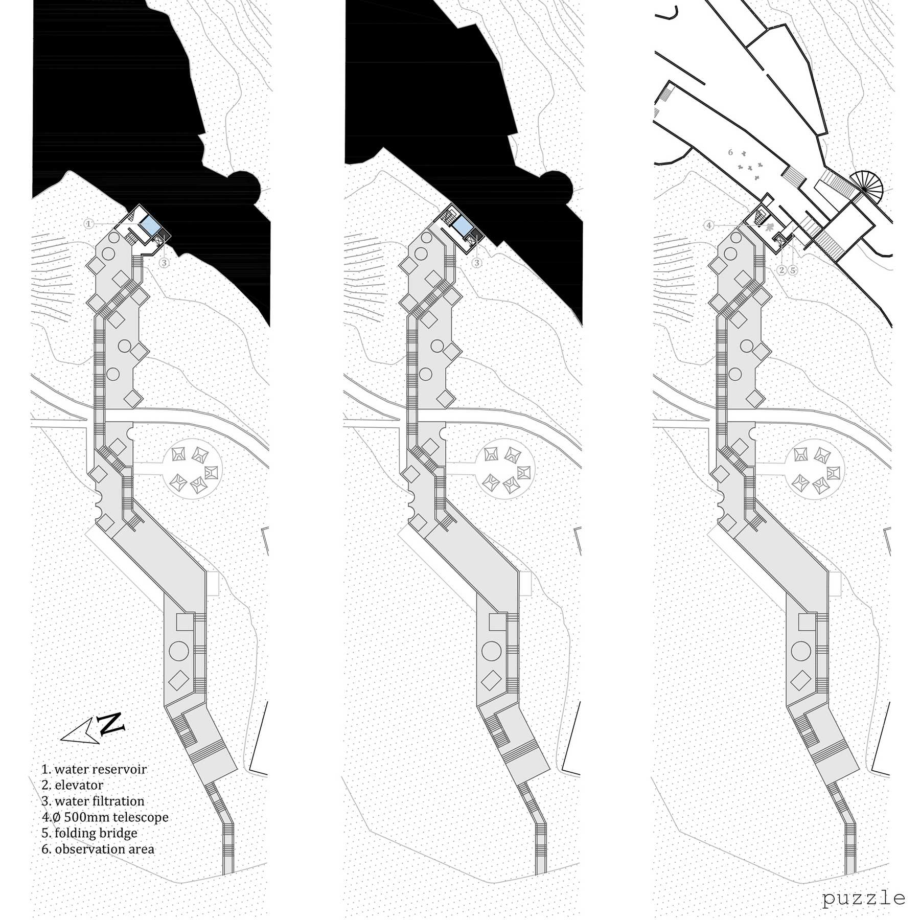 The linear gesture starts at the edge of the old town and ends with a tower that interprets the old tower which collapsed in 1940. An inner street connects the programs with the entrance of the building. At some points, the street opens to the outside and leads to the external extensions such as observatory swimming pool, observatory amphitheater, and various platforms for observing the landscape or camping.